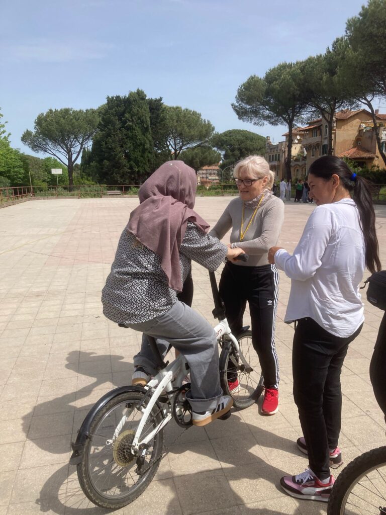 Un progetto a cui teniamo molto, e di cui siamo capofila, il cui obiettivo a Roma è quello di insegnare ad andare in bici a delle donne rifugiate afgane.